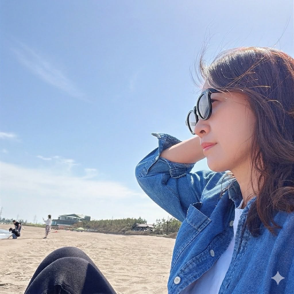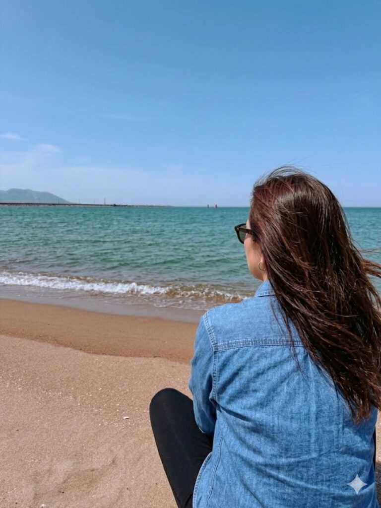 海を背景に黄昏ている写真を生成して。と